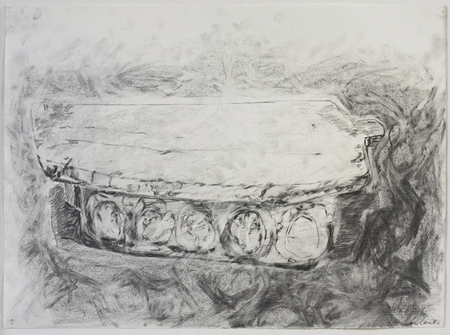 This is a rare offering from Ursula von Rydingsvard—first, as a drawing on paper, and second, as a representational image. It suggests a standard use of drawing, no less profound for its being perfunctory: to fix an object in memory. Line commits the vision of an African stool to paper, travelling along the stool’s planes and edges and carved details. But what of additional urgencies revealed in the handling of pencil: the meander of mark over a form we assume to be solid, the freedom and agitation of strokes at its periphery, and the many fingerprints at the top of the sheet? This tension between representation and gesture suggests to me a metaphoric narrative; and if hand-drawing in itself reveals a journey, perhaps the stool in this drawing is positioned as a means of transportation:
