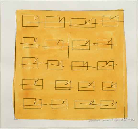 In 1976, Donald Judd made a small drawing in pencil on yellow paper, a color we don’t often associate with serious-minded “minimal” work. Lawrence Weiner’s drawing from the same collection, featured here, was made years later but uses this same “surprise” of a background color. Whereas the Judd is on colored paper, Weiner has delicately painted his background. The effect is to bring the image closer to the viewer, pulling it away from its white border and nearer to us –making it more real.