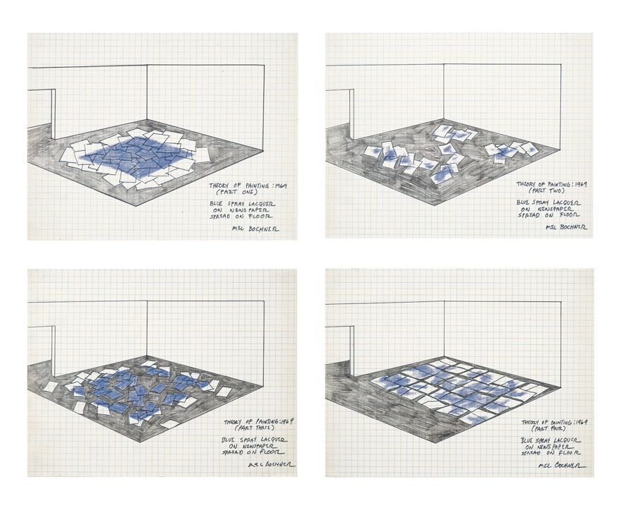 There is a paradox at the center of Theory of Painting—the graph paper gives it away. It is a set of instructions about how to make something: a plan, an architectural description of a kind of sequential change. And yet, it’s four drawings. Mel Bochner is making something and thinking about making something at the same time.